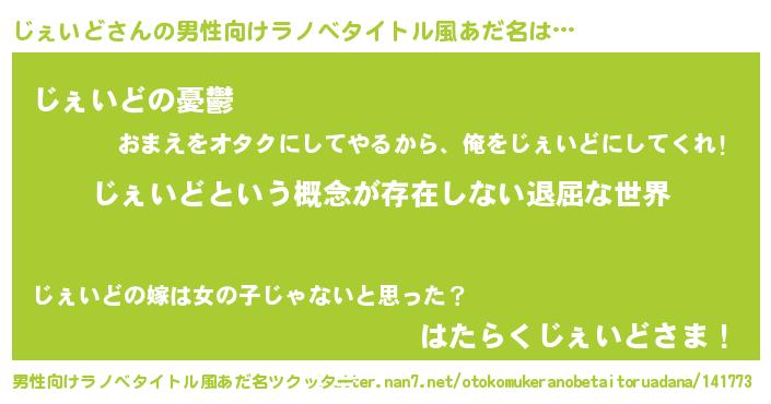 | 女子向けラノベタイトル風あだ名 | 『異世界で失敗しない100のじぇいど』 |