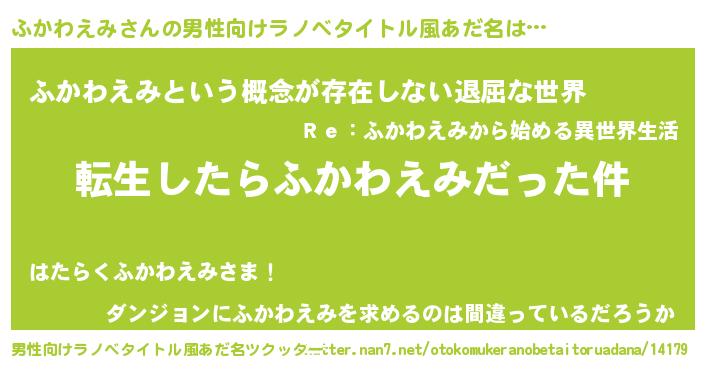 | ヘコむあだ名 | 『ふかわえみ(笑)』『ふか太郎』 |