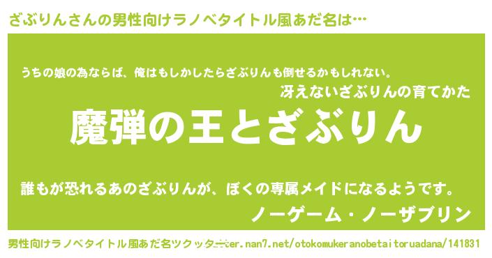 | 女子向けラノベタイトル風あだ名 | 『乙女ゲームの破滅フラグしかない悪役ざぶりんに転生してしまった…』 |