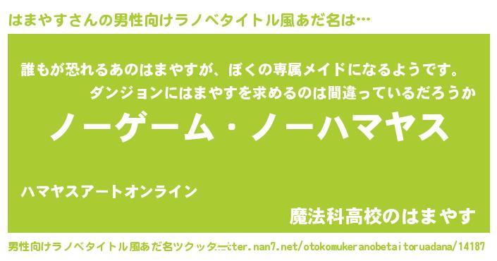 | 伝説のあだ名 | 『救世主となる錬金術士はまやす』 |