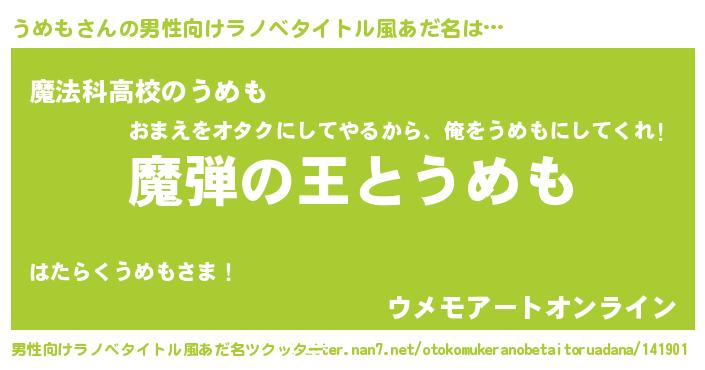 | 女子向けラノベタイトル風あだ名 | 『乙女ゲームの破滅フラグしかない悪役うめもに転生してしまった…』 |