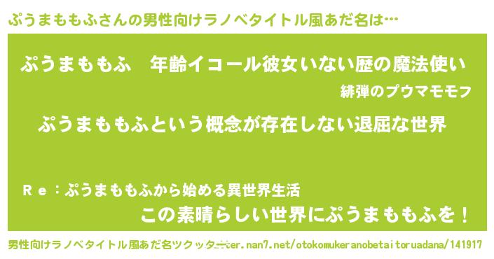 | 女子向けラノベタイトル風あだ名 | 『異世界で失敗しない100のぷうまももふ』 |