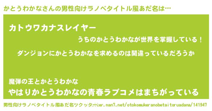 | 女子向けラノベタイトル風あだ名 | 『かとうわかなの卵を拾いまして』 |