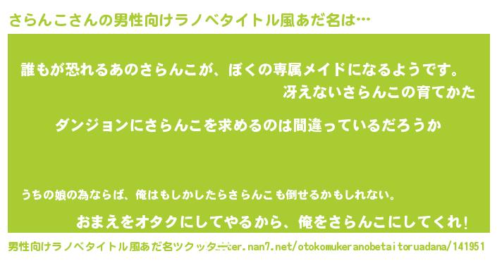 | 女子向けラノベタイトル風あだ名 | 『さらんこの卵を拾いまして』 |