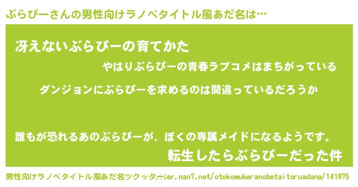 | 女子向けラノベタイトル風あだ名 | 『ぶらぴーの卵を拾いまして』 |