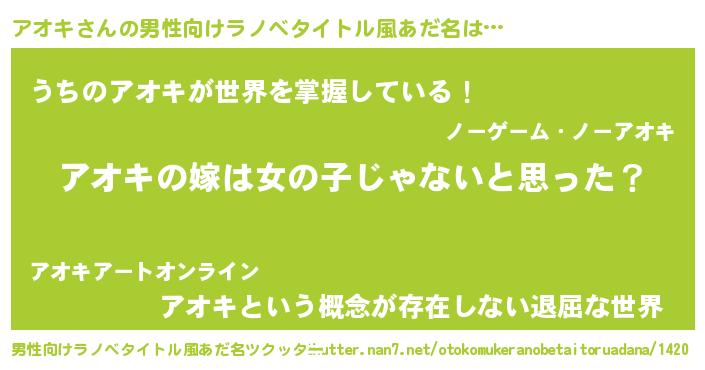 | 女子向けラノベタイトル風あだ名 | 『アオキ様がみてる』『死神アオキの再婚』 |