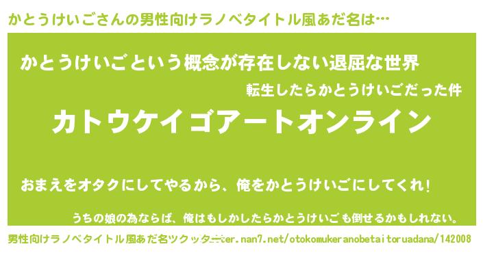 | ヒーロー風カッコイイあだ名 | 『スーパーカトウケイゴ』『暗黒騎士カト』 |