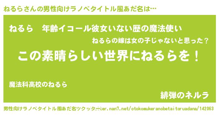 | 女子向けラノベタイトル風あだ名 | 『悪役ねるらに転生したようですが、知った事ではありません』 |
