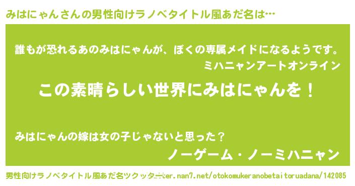 | 女子向けラノベタイトル風あだ名 | 『悪役みはにゃんに転生したようですが、知った事ではありません』 |