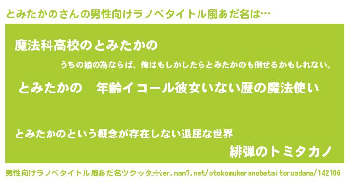 | 女子向けラノベタイトル風あだ名 | 『とみたかのの玉の輿計画!』 |