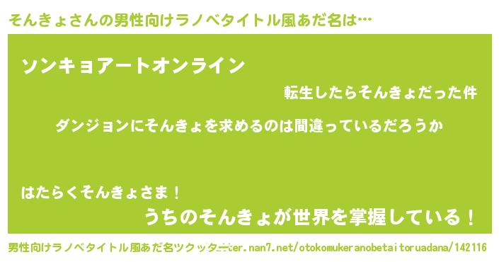 | 女子向けラノベタイトル風あだ名 | 『そんきょの卵を拾いまして』 |