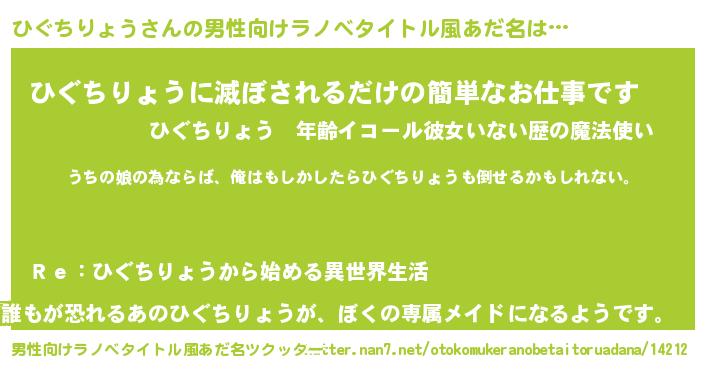 | 女子向けラノベタイトル風あだ名 | 『ひぐちりょうの婚約者』 |