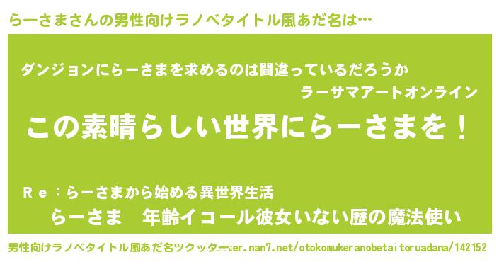 | 女子向けラノベタイトル風あだ名 | 『悪役らーさまに転生したようですが、知った事ではありません』 |