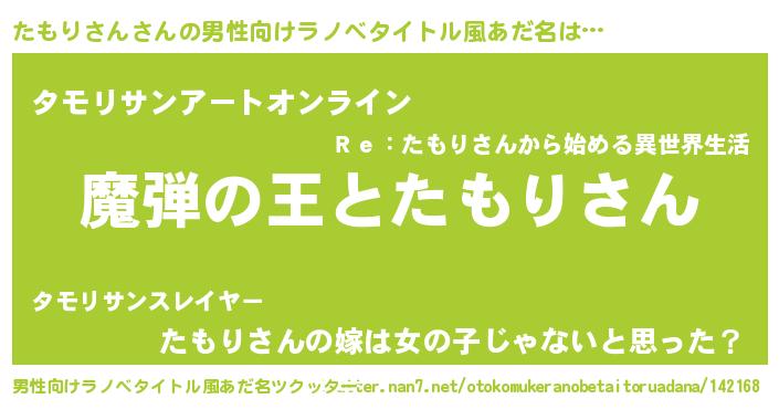 | 女子向けラノベタイトル風あだ名 | 『たもりさんが死なない童話 林檎のたもりさんの診療簿』 |