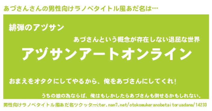 | 胡散臭い通販商品みたいなあだ名 | 『億万長者になれるブレスレット…その名も「あづさん」』 |