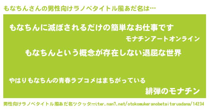 | 胡散臭い通販商品みたいなあだ名 | 『絶対に幸福をもたらす水素水…その名も「もなちん」』 |