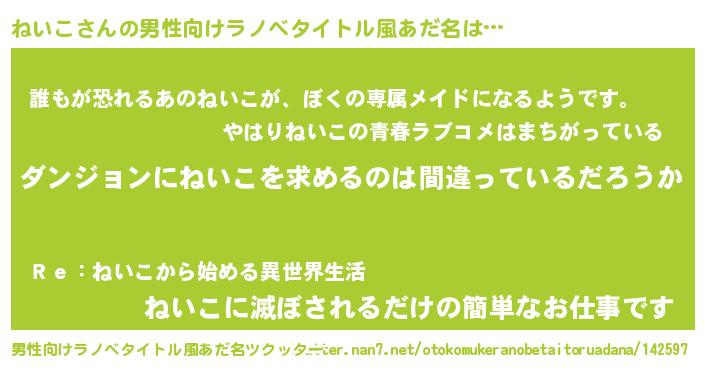 | ヒーロー風カッコイイあだ名 | 『魔戒騎士ネイ』『ネオネイコ』 |