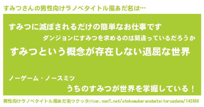 | 女子向けラノベタイトル風あだ名 | 『異世界で失敗しない100のすみつ』 |
