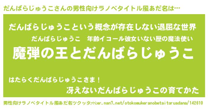 | 女子向けラノベタイトル風あだ名 | 『だんばらじゅうこが死なない童話 林檎のだんばらじゅうこの診療簿』 |