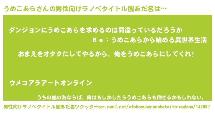 | 女子向けラノベタイトル風あだ名 | 『うめこあら夫妻のなれそめ』 |
