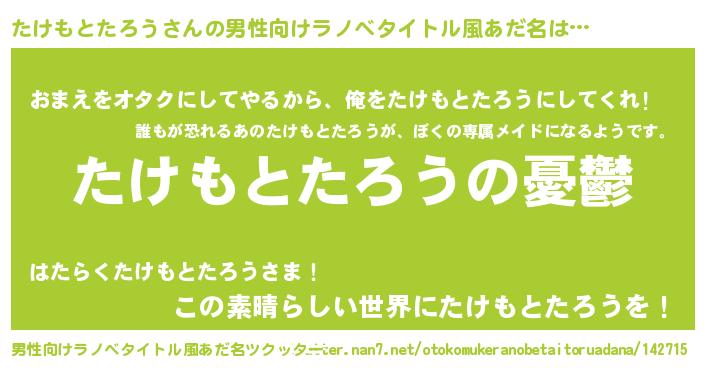 | 女子向けラノベタイトル風あだ名 | 『(仮)たけもとたろうのやんごとなき事情』 |
