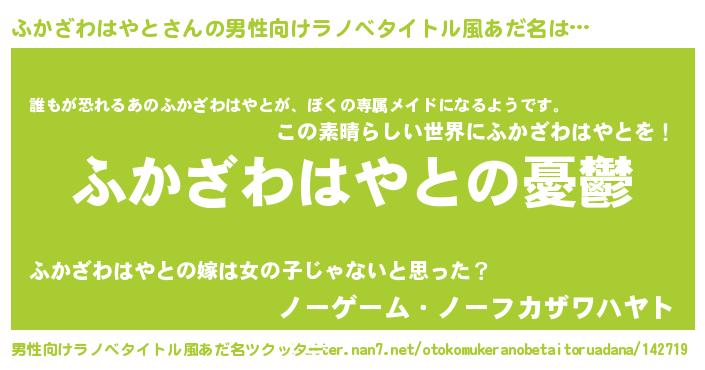 | 胡散臭い通販商品みたいなあだ名 | 『必ず成功する霊験あらたかなお札…その名も「ふかざわはやと」』 |
