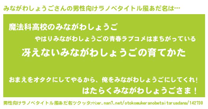 | 胡散臭い通販商品みたいなあだ名 | 『テレビで話題の高麗人参…その名も「みながわしょうご」』 |