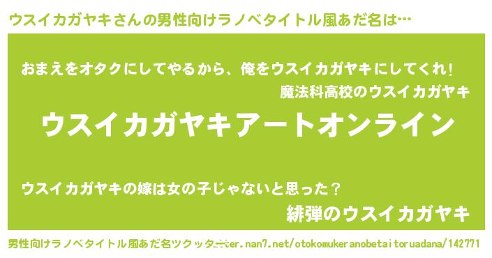 | 女子向けラノベタイトル風あだ名 | 『誰かこのウスイカガヤキを説明してください! ~契約から始まるウェディング~』 |