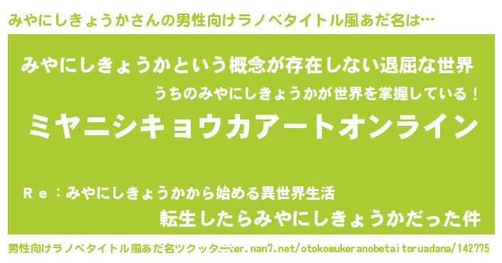 | 女子向けラノベタイトル風あだ名 | 『みやにしきょうか姫と円卓の騎士』 |