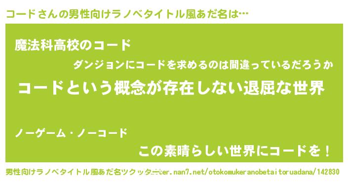 | 女子向けラノベタイトル風あだ名 | 『コードの契約王妃』『死神コードの再婚』 |