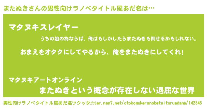 | 女子向けラノベタイトル風あだ名 | 『またぬき夫妻のなれそめ』 |