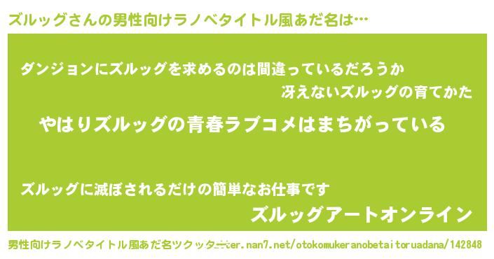 | 女子向けラノベタイトル風あだ名 | 『ズルッグの雑貨屋さん』 |
