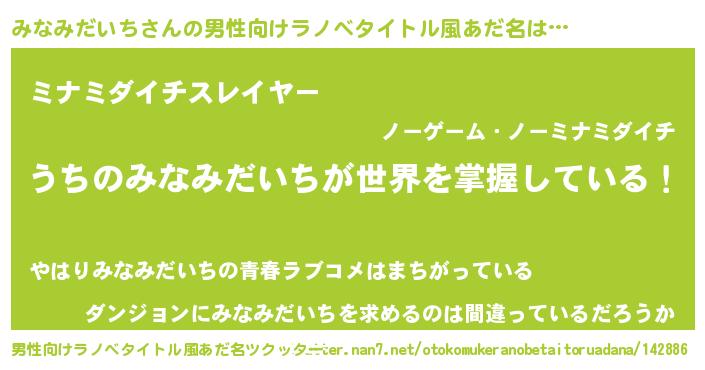 | ヒーロー風カッコイイあだ名 | 『天弓騎士ミナ』『ネオミナミダイチ』 |