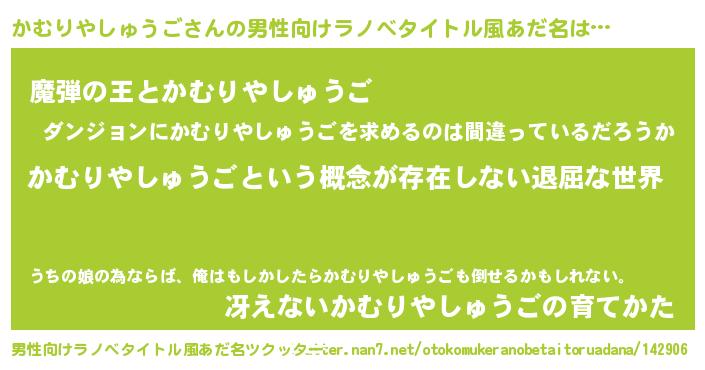 | 女子向けラノベタイトル風あだ名 | 『異世界で失敗しない100のかむりやしゅうご』 |