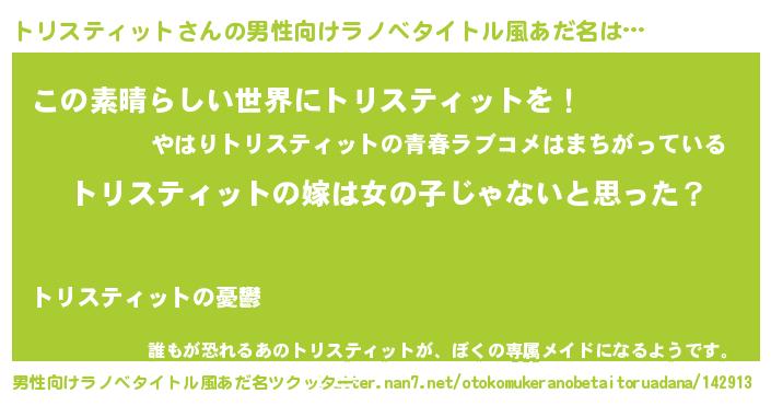| 女子向けラノベタイトル風あだ名 | 『トリスティットの卵を拾いまして』 |