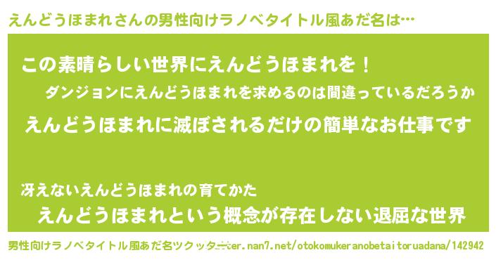 | 胡散臭い通販商品みたいなあだ名 | 『あなたにだけ特別に提供する限定10本のレアな日本酒…その名も「えんどうほまれ」』 |