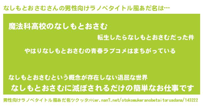 | 女子向けラノベタイトル風あだ名 | 『なしもとおさむ伯爵の花嫁』 |