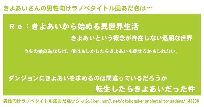 | 女子向けラノベタイトル風あだ名 | 『きよあい伯爵の花嫁』 |