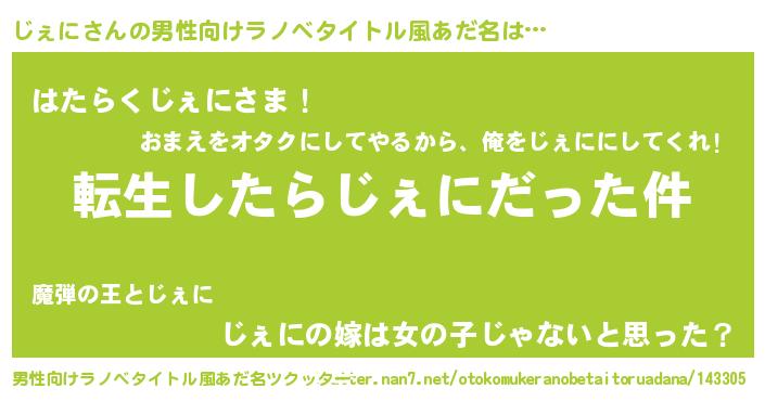 | 女子向けラノベタイトル風あだ名 | 『じぇにの玉の輿計画!』 |