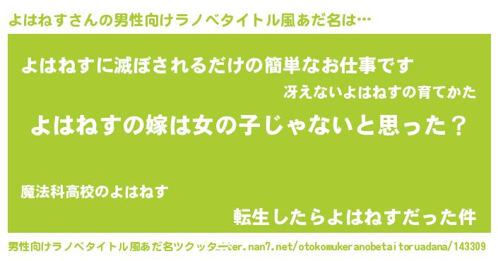 | 女子向けラノベタイトル風あだ名 | 『よはねすの卵を拾いまして』 |