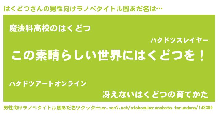 | 女子向けラノベタイトル風あだ名 | 『悪役はくどつに転生したようですが、知った事ではありません』 |
