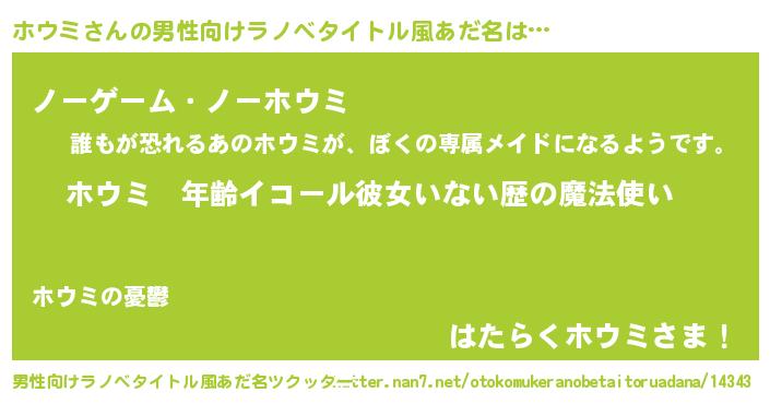 | 女子向けラノベタイトル風あだ名 | 『ホウミの玉の輿計画!』 |