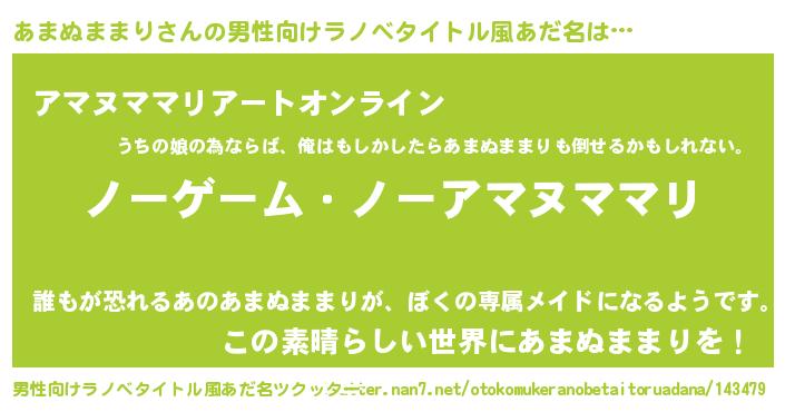 | 女子向けラノベタイトル風あだ名 | 『死神あまぬままりの再婚』 |
