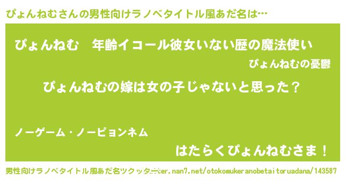 | 女子向けラノベタイトル風あだ名 | 『ぴょんねむの卵を拾いまして』 |