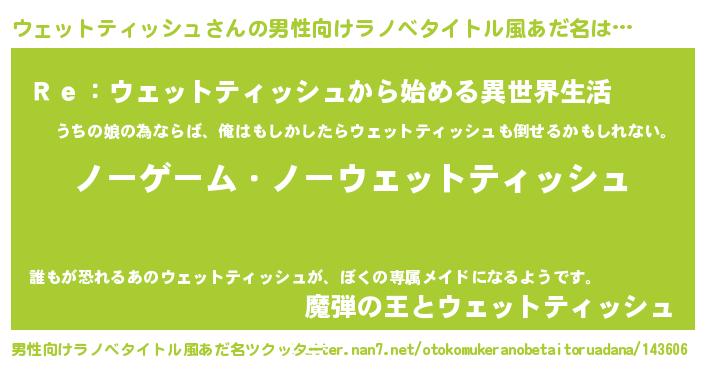 | 女子向けラノベタイトル風あだ名 | 『死神ウェットティッシュの再婚』 |