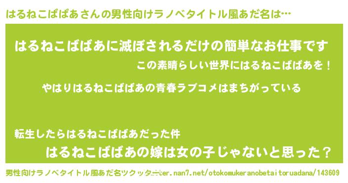 | 女子向けラノベタイトル風あだ名 | 『はるねこばばあの雑貨屋さん』 |