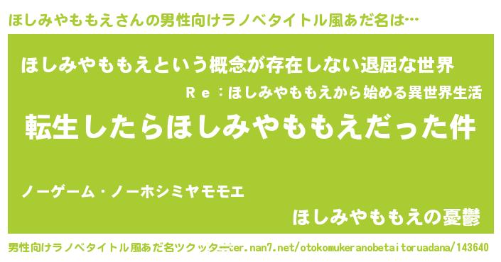 | 女子向けラノベタイトル風あだ名 | 『ほしみやももえの玉の輿計画!』 |