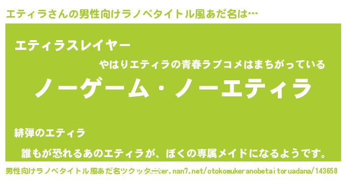 | 女子向けラノベタイトル風あだ名 | 『エティラ恋絵巻』『エティラの契約王妃』 |