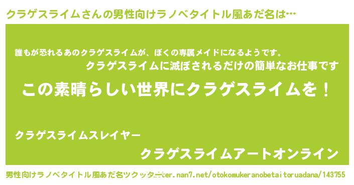 | 意味不明あだ名 | 『住所不定無職クラゲスライム(8歳)』 |