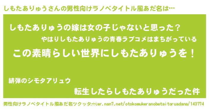| 女子向けラノベタイトル風あだ名 | 『乙女ゲームの破滅フラグしかない悪役しもたありゅうに転生してしまった…』 |